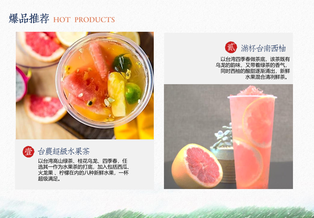 知茶方制茶,呈茶香亦求新生。臺灣高山族茶——茶浪嘿忠于中國傳統(tǒng)茶道,專注呈現(xiàn)高山茶香,回歸茶葉原本的味道,甄選最優(yōu)質(zhì)的茶葉,采用最精湛的制茶技藝,打造最醇美原生好茶。在此基礎(chǔ)上融入四季果茶、冷泡茶、奶蓋茶等年輕女性喜愛的流行元素,以濃郁香醇口感+健康美味、有顏有料食材+富有時尚品味的品牌形象,打造茶飲新風尚,深得大眾喜歡。